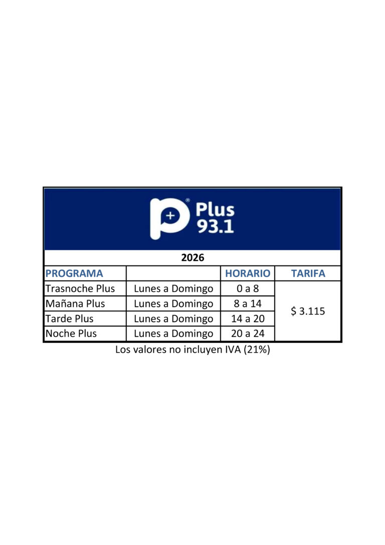 Frecuencia Plus es una radio dirigida a oyentes de entre 35 a 65 años, programa música suave con una una selección de calidad, temas clásicos de todos los tiempos. Una radio que permite a las marcas acercase a un público específico y conectarse en forma directa, simple y eficiente para comunicar.